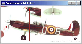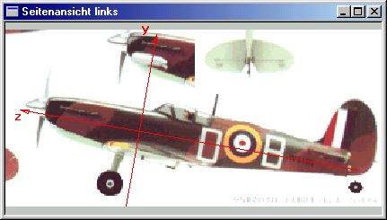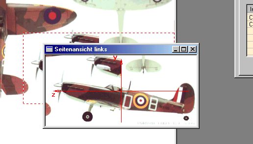 Definieren wir zunächst die linke Seitenansicht. Wählen Sie dazu Fotogrammetrie, Ansicht definieren und Seitenansicht links. Der Mauszeiger verwandelt sich in ein Fadenkreuz, mit dem Sie nun im Fenster Mehrseitenansicht die linke Seitenansicht mit gedrückter linker Maustaste einrahmen können. Es macht nichts, wenn Sie dabei auch Teile anderer Ansichten mit einrahmen. Nach dem Loslassen der linken Maustaste öffnet sich ein neues Fenster Seitenansicht links: