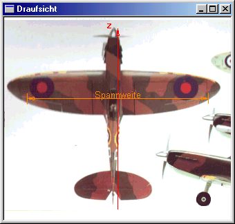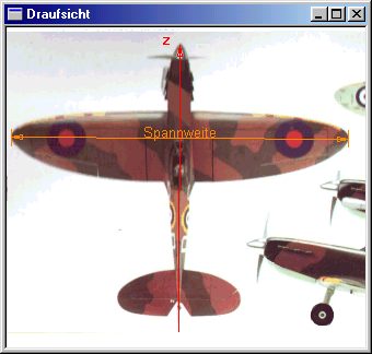 Plazieren Sie die Z-Achse durch Verschieben und Rotieren genau über die gedachte Längsachse des Modells. Die X-Achse des Koordinatensystems wird erst später sichbar. Um den Maßstab aller Ansichten zu definieren, ziehen Sie die Pfeile der Bemaßungslinie an die Enden der Tragfläche: