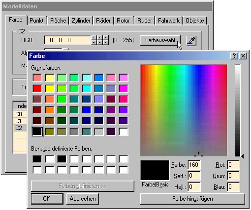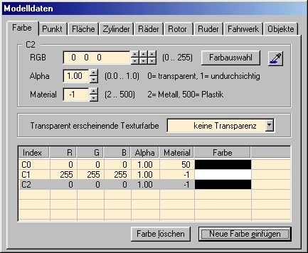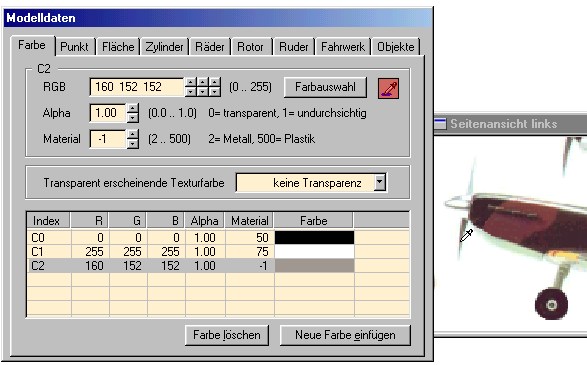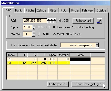 Bisher haben wir alle Flächen mit Texturen überzogen und als Grundfarbe dafür die Farbe Weiß gewählt. Für den Propeller haben wir keine Textur zur Auswahl. Wir können aber eine neue Farbe definieren. Klicken Sie dazu auf die Schaltfläche Neue Farbe einfügen.