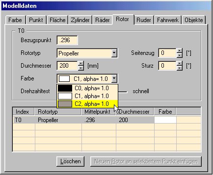 Um den Propeller auf unsere neue Farbe zu setzen, wechseln Sie im Fenster Modelldaten auf die Registerkarte Rotor. Im Kombinationsfeld Farbe können Sie nun die neue Farbe C2 auswählen.
