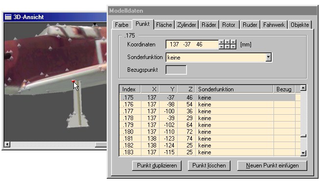 Das Besondere an der Konstruktion eines Fahrwerkes ist nun, daß alle Punkte, die Bestandteil eines Fahrwerksbeines sind, einen Verweis auf denjenigen Punkt tragen müssen, der die Verbindung zum Rumpf bzw. der Tragfläche kennzeichnet. Erst der Verweis auf diesen Bezugspunkt ermöglicht bei entsprechenden Belastungen die Simulation des physikalisch korrekten Federns des Fahrwerksbeines. Den Bezugspunkt unseres linken Fahrwerksbeines (hier .175) zeigt die folgende Ansicht:
