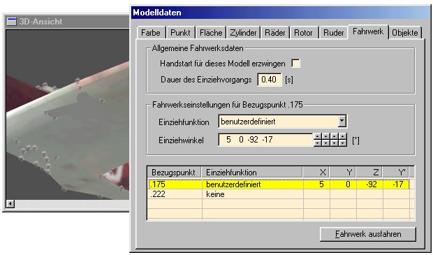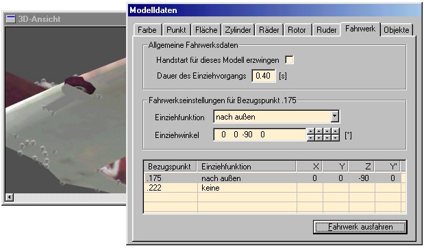 Zum Definieren eines Einziehfahrwerkes wechseln Sie auf die Registerkarte Fahrwerk im Fenster Modelldaten: