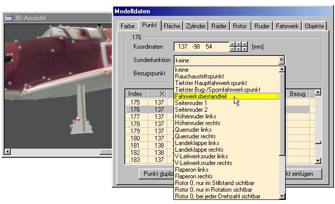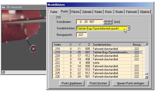 Was bei der Verwendung eines Rades aus der Registerkarte Räder automatisch und für uns unsichtbar passierte, müssen wir hier manuell durchführen: Der tiefste Punkt des Fahrwerksbeines, also der unterste Punkt des Spornrades, muß im Kombinationsfeld Sonderfunktion der Registerkarte Punkt als Tiefster Bug-/Spornfahrwerkspunkt gekennzeichnet werden: