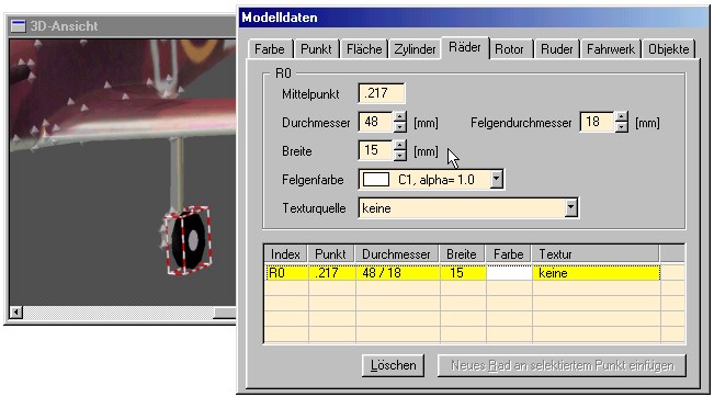 Beachten Sie, daß der Bezugspunkt selbst nicht als Fahrwerksbestandteil gekennzeichnet sein muß. Nach Bearbeitung aller Punkte des Fahrwerksbeines fügen wir noch das Rad ein. Selektieren Sie dazu denjenigen Fahrwerkspunkt, durch den die spätere Radachse verlaufen soll. Öffnen Sie dann mit der rechten Maustaste das Kontextmenü der 3D-Ansicht und wählen Sie Einfügen am selektierten Punkt, Rad.