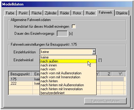 Für jedes zuvor konstruierte Fahrwerksbein existiert bereits ein Eintrag in der Liste. Um das Hauptfahrwerksbein in ein Einziehfahrwerk zu verwandeln, selektieren Sie den zugehörigen Eintrag (Bezugspunkt .175) und wählen Sie im Kombinationsfeld Einziehfunktion die gewünschte Einziehrichtung: