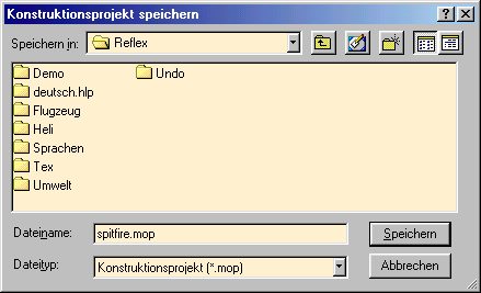 Geben Sie als Dateinamen den Modellnamen ein, also spitfire. Die Endung .mop eines Konstruktionsprojektes wird automatisch angehängt nachdem Sie auf Speichern geklickt haben.